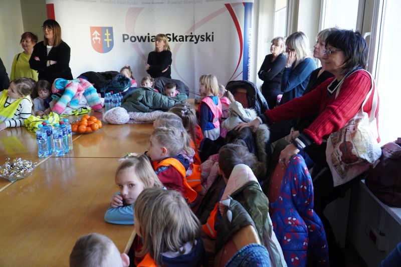 W sali, gdzie odbywają się cotygodniowe posiedzenia Zarządu Powiatu Skarżyskiego mali goście spotkali się z wicestarostą Katarzyną Bilską i sekretarz Małgorzatą Nosowicz, od których dowiedzieli się po co jest starostwo, kto może korzystać z usług tego urzędu i jakie sprawy będą mogli tu załatwić w przyszłości. Przedszkolaki obejrzały również krótki film promujący walory i atrakcje powiatu. Nie zabrakło także wspólnego śpiewania znanej wszystkim piosenki przedszkolaków „Stary niedźwiedź mocno śpi”.